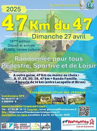 - La plus grande manifestation Pédestre FFRandonnée du Lot-et -Garonne et de France se déroulera le dimanche 27 Avril 2025. L'accueil se fait à partir de 7h30 le dimanche au Centre Culturel de FUMEL.