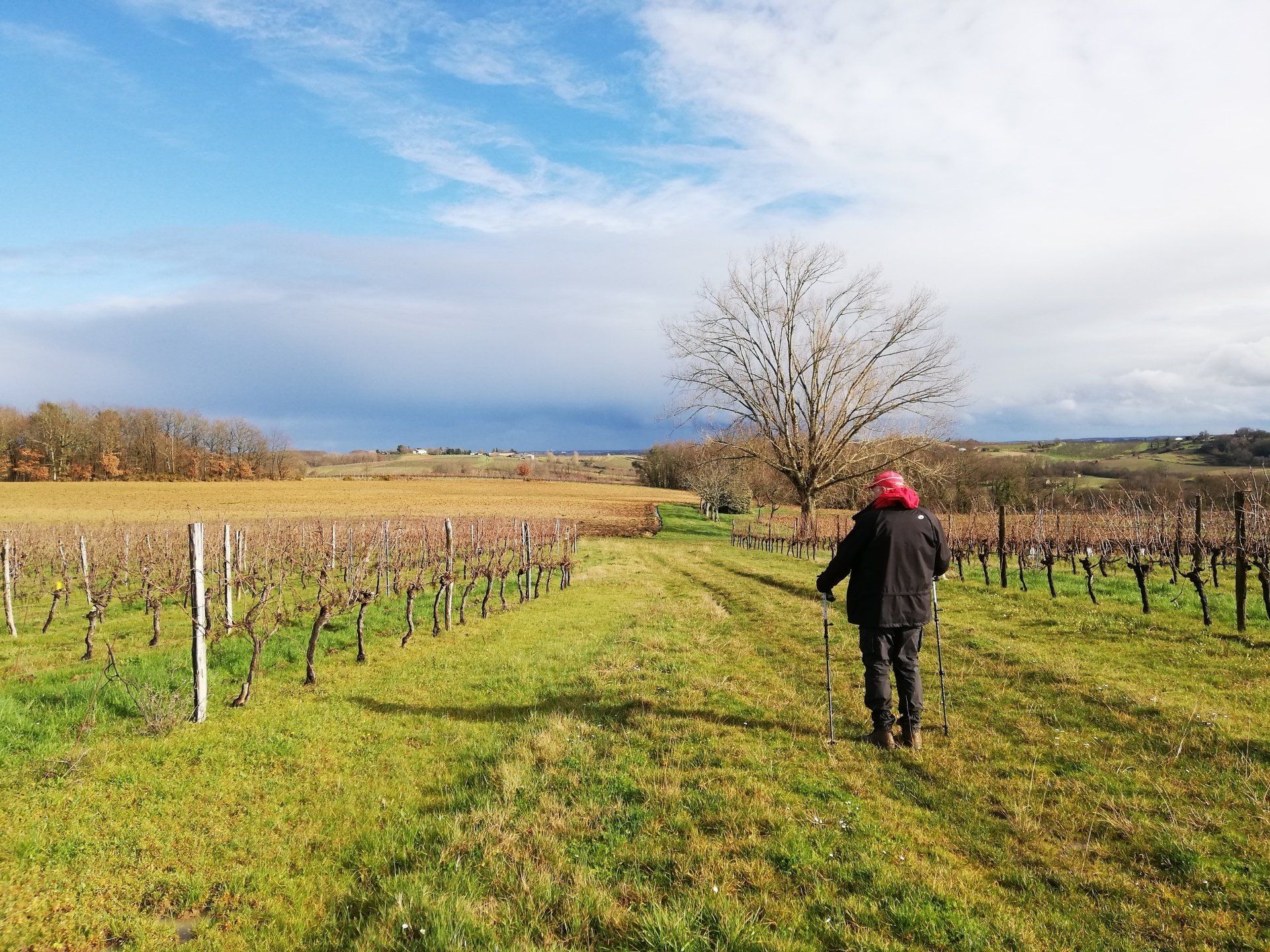 Jeudi 4 mars 2021 à Bernac, commune de Loubès-Bernac (47120). Marche par une après-midi ensoleillée, dans des paysages ouverts, des vignes où une agricultrice liait les sarments de vigne avec une lieuse, à vigne, électrique à batterie. Travail répétitif facilité par l'appareil mais qui reste éprouvant...
